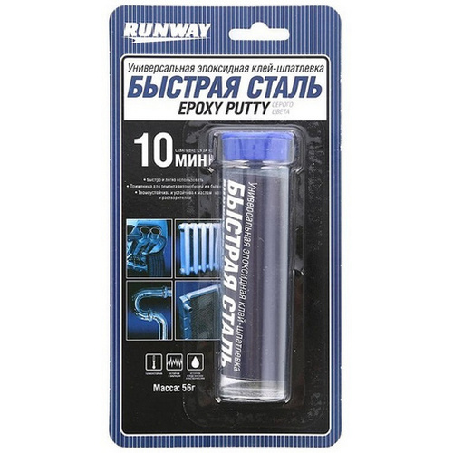 Надежно и быстро склеивает различные материалы - металл, фарфор, стекло, керамику, дерево, пластик. Применяется для ремонта и восстановления большого числа изделий: радиатора, глушителя, аккумулятора, картера, корпусных и кузовных деталей. Также может применяться в быту для ремонта: мебели, сантехники, труб горячей и холодной воды, инструментов, аквариумов, зеркал и многого другого. Возможен ремонт под водой. Быструю сталь легко использовать для изготовления отломанных или потерянных деталей методом лепки. Обладает хорошими изоляционными свойствами. Устойчива к воздействию химических растворителей, бензина, воды и ультрафиолетовым лучам, выдерживает высокую температуру до 260С. Схватывается за 10 минут, отвердевает за 20 минут, конечная прочность склеивания достигается за час. После отвердевания шпатлевки поверхности можно сверлить, нарезать в них резьбу, обтачивать, шкурить, красить.Купить клей-шпатлевку эпоксидную универсальную БЫСТРАЯ СТАЛЬ RUNWAY
