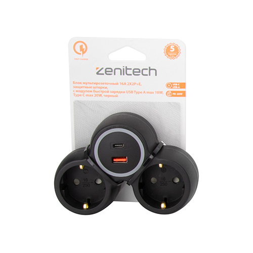 Блок мультирозеточный 16A 2X2P+E, защитные шторки, с модулем быстрой зарядки USB Type A max 18W, Type C max 20W, цвет черныйЛинейка продукции : Zenitech
