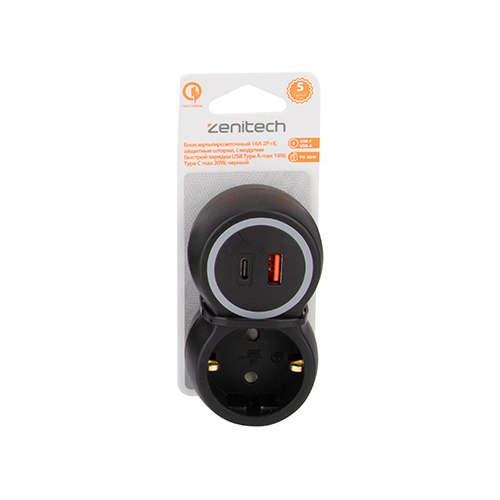 Блок мультирозеточный 16A 2P+E, защитные шторки, с модулем быстрой зарядки USB Type A max 18W, Type C max 20WЛинейка продукции : Zenitech