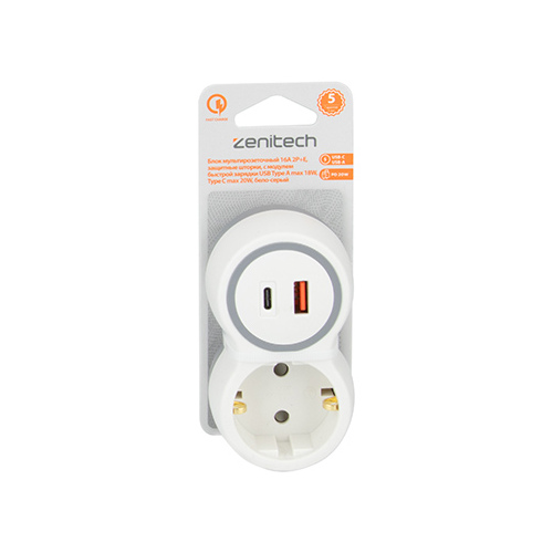Блок мультирозеточный 16A 2P+E, защитные шторки, с модулем быстрой зарядки USB Type A max 18W, Type C max 20WЛинейка продукции : Zenitech