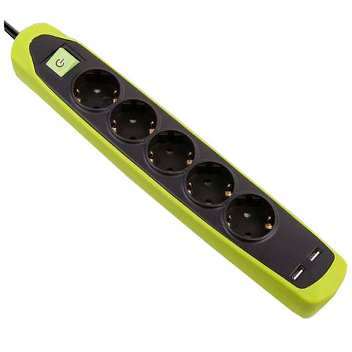 Удлинитель 5Р кабель ПВС 3G1.0 мм 2м с двумя USB разъемами черный зеленый