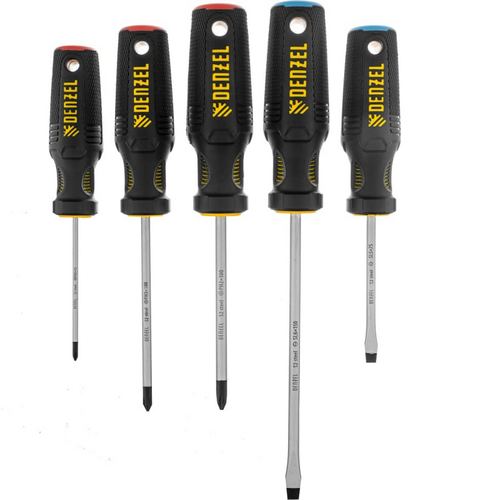 Набор Denzel 122157 из 5 отверток с трехкомпонентными рукоятками, изготовленных из стали S2, используется для монтажа и демонтажа резьбового крепежа со шлицами типа SL и PH. Высокоточные шлицы намагничены, поэтому во время работы не нужно придерживать винты или саморезы рукой. Набор подходит для интенсивного использования.Купить набор отвёрток 5шт PH+SL S2 3к рукоятка Denzel