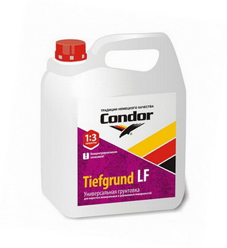 Акриловая грунтовка глубоко проникающая для внутренних и наружных работ, не содержащая органических растворителей для грунтования пористых минеральных и деревянных поверхностей под покраску, оклейку обоями, облицовку керамической плиткой, под нанесение декоративной штукатурки, для наружных и внутренних работ. Наносится на минеральные (кирпичная кладка, бетон, газобетон, оштукатуренные или зашпатлеванные поверхности, цементно-волокнистые плиты, гипсокартон и др.), деревянные (в том числе ДСП, ДВП), ранее окрашенные водно-дисперсионными красками и другие пористые поверхности зданий и сооружений. Для грунтования нормально впитывающих поверхностей разбавить чистой холодной водой в соотношении 1:3, для слабо впитывающих (гипсокартон, древесина) 1:2. Проблемные (осыпающиеся) поверхности грунтовать дважды с интервалом не менее чем 6 ч. Цвет белый, после высыхания прозрачный. Расход 10-33.3 м2/л концентрата. В зависимости от впитывающей способности поверхности при однослойном нанесении. Покраску загрунтованной поверхности проводить после полного высыхания грунтовки, но не ранее, чем через 12 ч после ее нанесенияю.Купить грунтовкау акриловую Tiefgrund LF универсальную 10 кг Condor