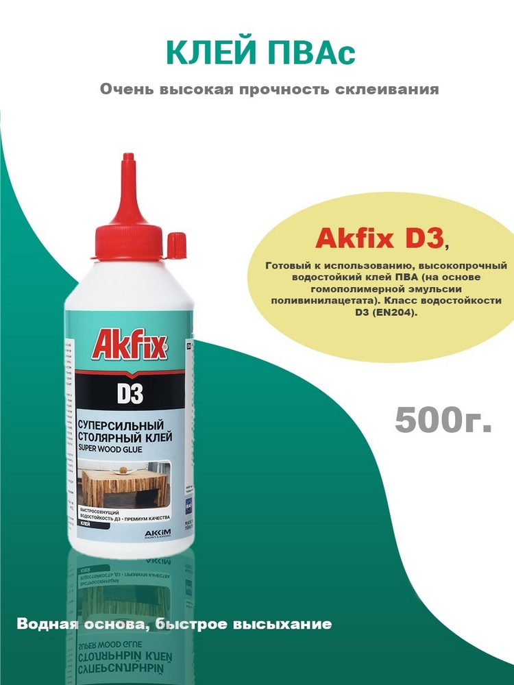 AKFIX D3 - готовый к использованию, высокопрочный водостойкий клей ПВА (на основе гомополимерной эмульсии поливинилацетата). Класс водостойкости D3 (EN204).Akfix D3 является сильным клеем, который может быть использован для склеивания всех изделий из древесины в нормах Д3. Впитываясь в поверхность обеспечивает полное склеивание. Образует надежную и белую пленку. Является устойчивым против бактериологической порчи и плесени.