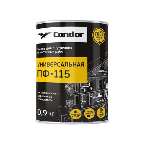 Эмаль алкидная ПФ-115 предназначена для защитно-декоративной окраски металлических (металлоконструкции, ворота, изгороди, оборудование и др), деревянных (дверей, оконных переплетов, садово-парковой мебели и пр.) и других поверхностей, подвергающихся атмосферным воздействиям и для окраски поверхностей внутри помещений (кроме полов).Не применять для окрашивания оцинкованных поверхностей, цветных металлов и нержавеющей стали. Изделия из древесины (оконные рамы, двери, плинтусы, обшивочные доски, детали мебели и др.), минеральные поверхности, загрунтованные металлические детали (элементы интерьеров, фасадов, деталей мебели) Металлические поверхности предварительно рекомендуется прогрунтовать грунтовкой Condor ГФ- 021. Окрашивание следует производить исключительно при положительной температуре. Расход 100-180 г/м? при однослойном нанесении. Время высыхания каждого слоя эмали при температуре (20 2) С 24 ч. (эмали красная и вишневая сохнут 48 ч.)