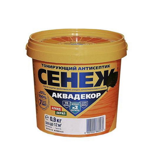 Антисептик СЕНЕЖ АКВАДЕКОР впитывается в древесину и образует на ее поверхности прозрачное атмосферостойкое воздухопроницаемое грязе- и водо- отталкивающее полимерное покрытие, предохраняющее древесину от биопоражения, выгорания под действием солнечных УФ лучей, воздействия атмосферных осадков.