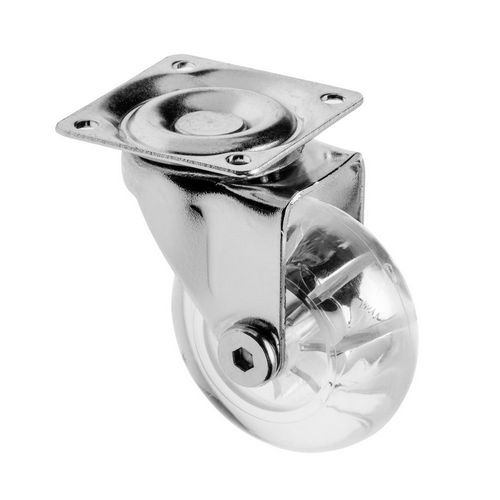 Колесо поворотное D-50мм прозрачное со стопором Brazylia, нагрузка 40 кг - изящная подвижная опора для различных мебельных конструкций. Это поворотное колесо может быть установлено в передвижную тумбочку, офисный столик, шкафчик и в другие офисные и бытовые конструкции. Опора к мебели крепится посредством металлической пластины (площадки).Купить колесо мебельное Brazylia 50мм прозрачное
