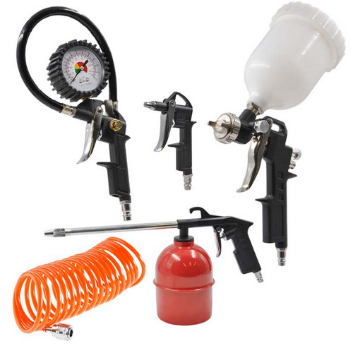 Состоит из 5 элементов: краскопульт HVLP, пистолет продувочный, пистолет моечный, пистолет для подкачки шин с манометром, шланг спиральныйРекомендованное рабочее давление, Бар: краскопульт 3,5 пистолет продувочный 2,0-6,0 пистолет моечный 6,0 пистолет для подкачки шин 3,5