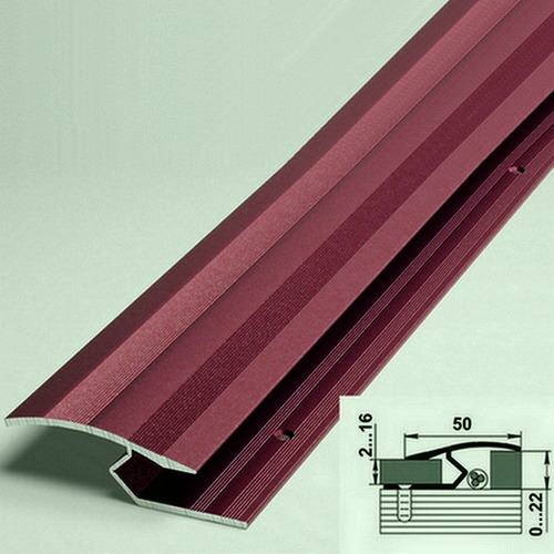 Z-образная ножка с продольными надпилами дает возможность верхней части профиля принимать необходимый угол наклона и способствует более плотному прилеганию профиля к напольному покрытию.Способ декорирования- анодирование.