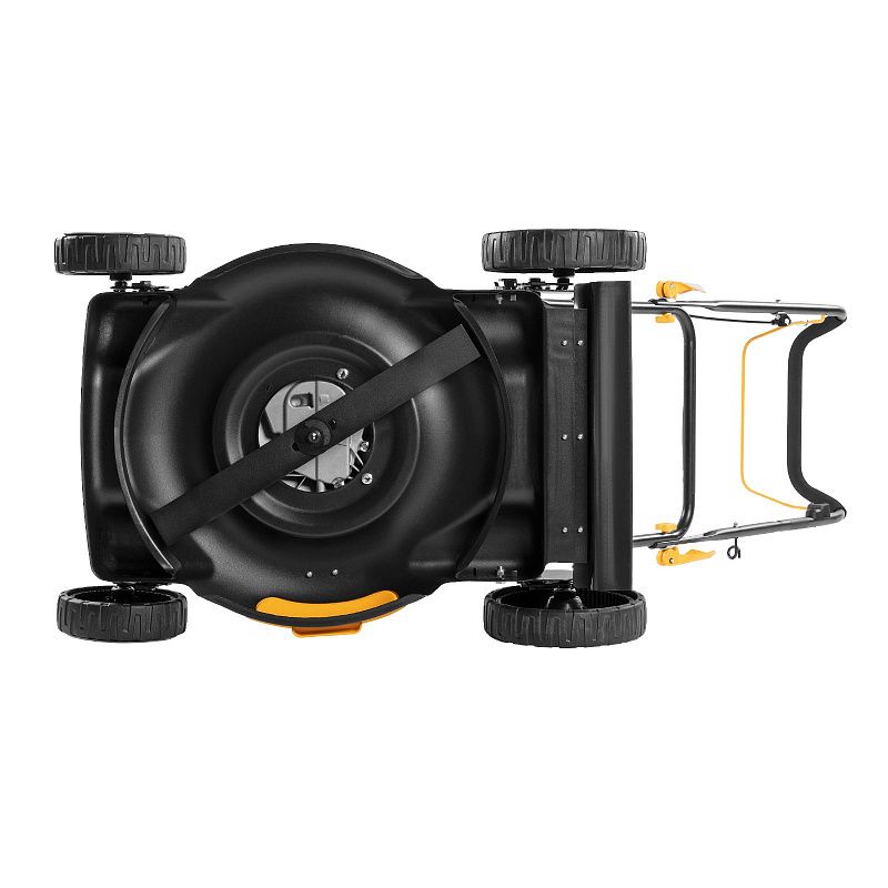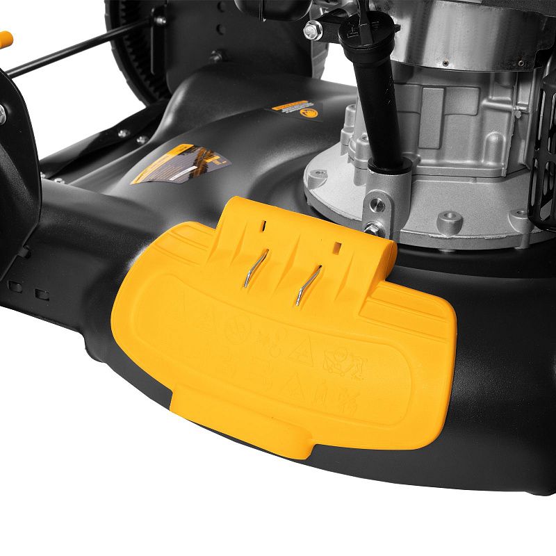 - Конструкция не предусматривает наличие травосборника, поэтому трава распределяется по газону: возможен боковой выброс и переработка травы в органическое удобрение (режим мульчирования).