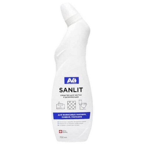 Средство чистящее для унитаза AVKO Санлит 0,75 л предназначается для удаления с поверхности унитазов, фаянсовых раковин, кафеля устойчивых загрязнений (мочевого и водного камня, ржавчины), обладающие дезинфицирующим и дезодорирующим эффектами.Способ применения: