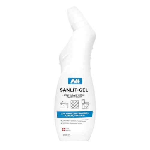 САНЛИТгель - средство для чистки и дезинфекции унитазов, фаянсовых раковин, кафеля. Гелеобразная консистенция, удаление водного, мочевого камня и ржавчины, освежающий запах.Купить средство для чистки и дезинфекции унитазов Санлит-гель 0,75л
