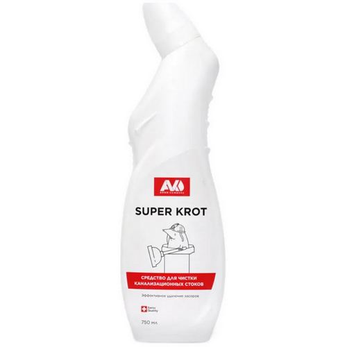 Средство для устранения засоров AVKO Супер Крот 0,75л предназначается для удаления засоров, возникающих в процессе эксплуатации системы канализации (жировых, белковых и растительных остатков пищи, остатков волос, нитей и другое) во всех видах канализационных труб (кроме изготовленных из алюминия и цинка и их сплавов).Способ применения: