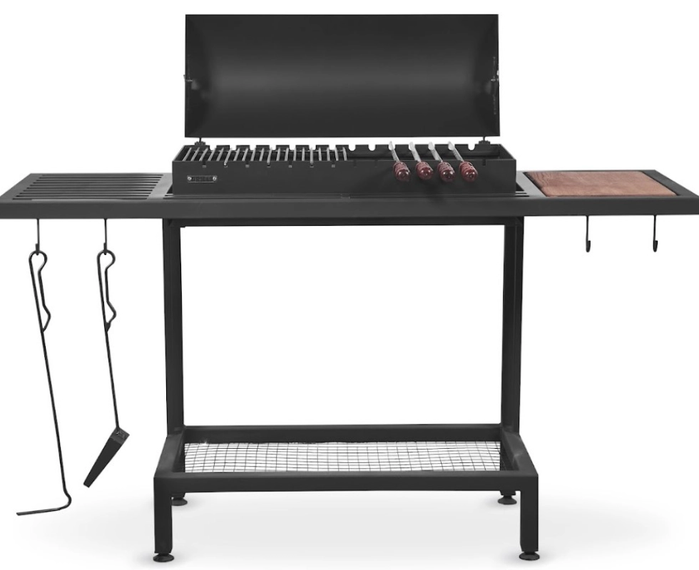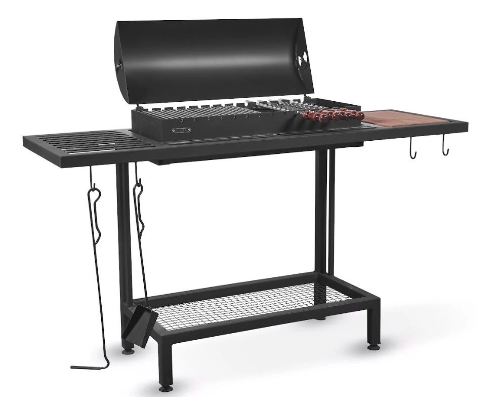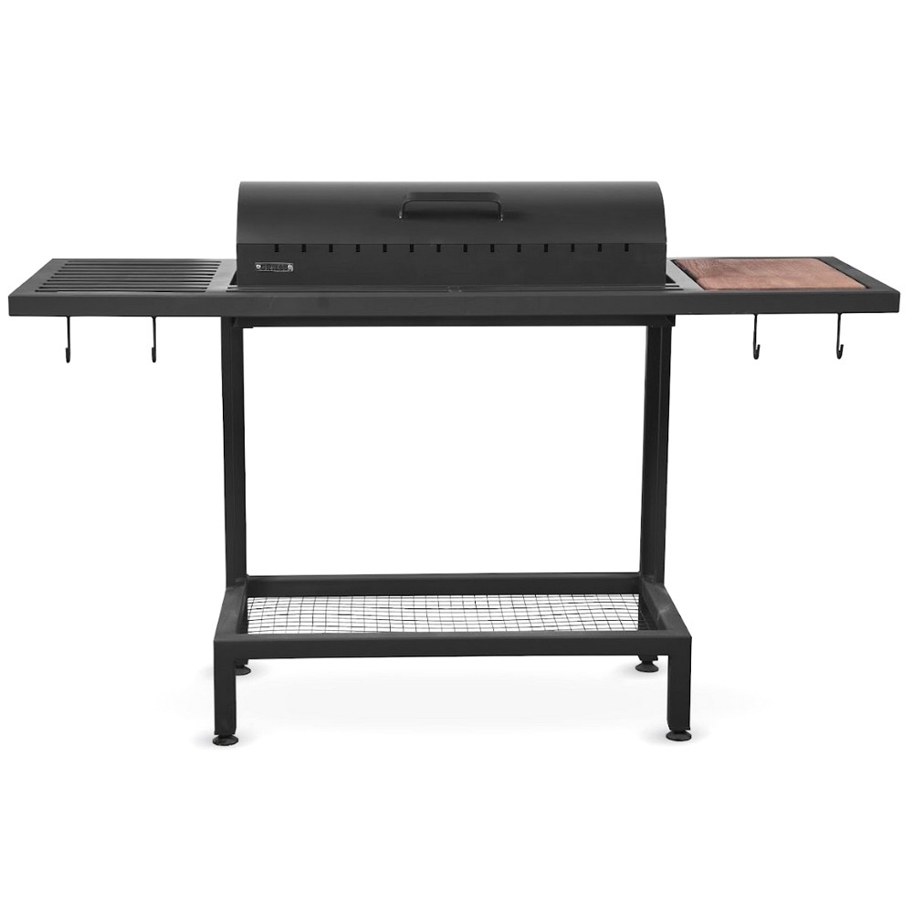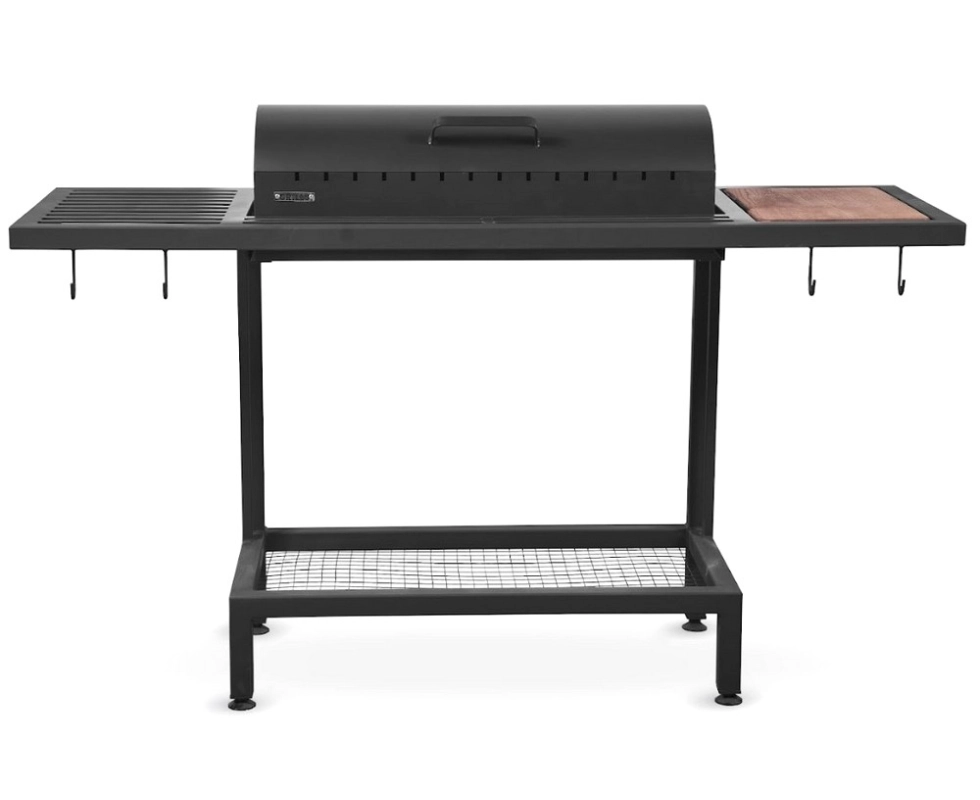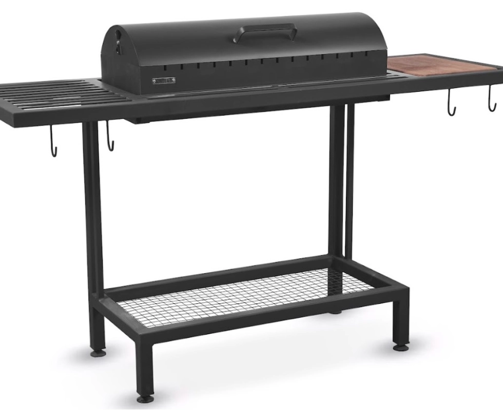 Барбекю это печь для приготовления мяса на жару от тлеющего угля. По сути это жаровня, где горит топливо, а сверху лежит решётка, на которой раскладывается еда. Сверху она закрывается крышкой, что помогает защитить обед от дождя и сохранить жар. Можно разместить 14 шампуров.Характеристики: