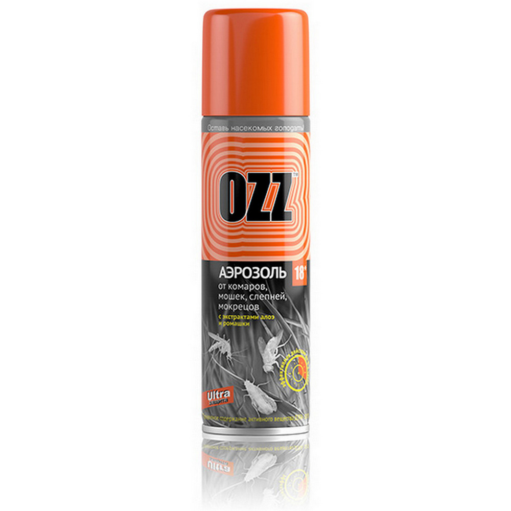 Надежная защита на природе от комаров мошек слепней мокрецов OZZ - произведено в Белоруси. Репеллентный аэрозоль ''OZZ-18'' обеспечивает эффективную защиту от кровососущих насекомых (комаров, мошек, слепней, кусающих мух) в течении 3-4 часов. Предназначено для нанесения на открытые участки тела и одежду, не оставляет следов. Незаменимое средство для отдыха в местах большого скопления насекомых.Купить аэрозоль от комаров мошек слепней OZZ 18 Ultra 150 мл