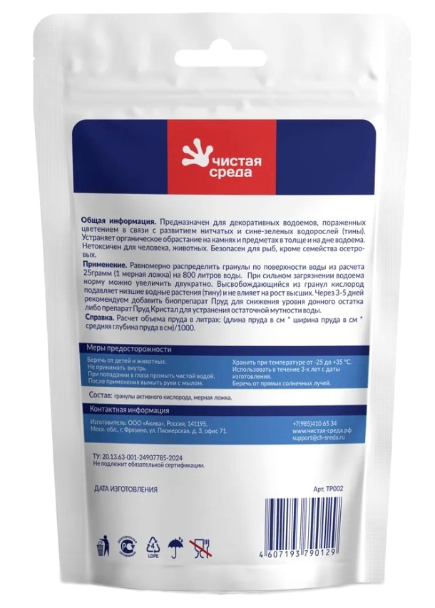 Предназначен для декоративных водоемов, пораженных цветением в связи с развитием нитчатых и сине-зеленых водорослей (тины). Устраняет органическое обрастание на камнях и предметах в толще и на дне водоема. Нетоксичен для человека и животных. Безопасен для рыб, кроме семейства осетровых.Купить пруд Актив 150гр