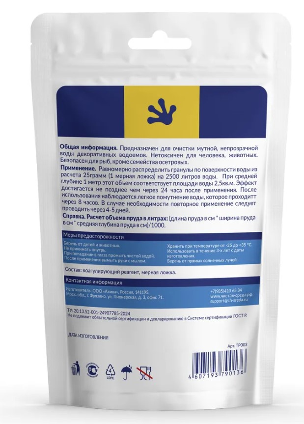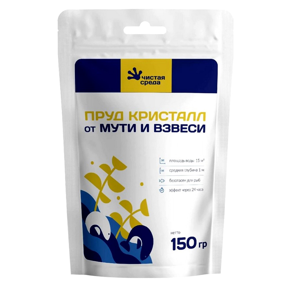 Предназначен для очистки мутной, непрозрачной воды декоративных водоемов. Нетоксичен для человека, животных. Безопасен для рыб, кроме семейства осетровых.Купить пруд Кристалл 150гр