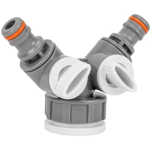 Фитинг с двумя кранами для присоединения сразу двух шлангов к источнику воды. С одной стороны два штуцера для стандартных быстросоединителей, с другой внутренняя резьба 1'', которая вкручена в резьбу 3/4'' и может выкручиваться. При необходимости можно использовать нужный размер резьбы.Купить Тройник с двумя кранами, штуцерами под быстросъемы, внутр. резьбой 3/4''-1'' Ф15