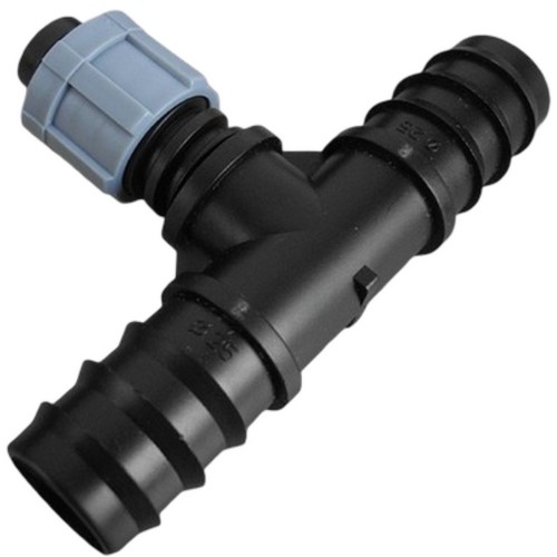 Тройник для присоединения двух шлангов 16мм и капельной ленты 16мм. Основной элемент для отвода капельной ленты под прямым углом к подводящему шлангу в небольших системах.Крепление шланга - штуцер-елочка, крепление ленты - штуцер с гайкой.