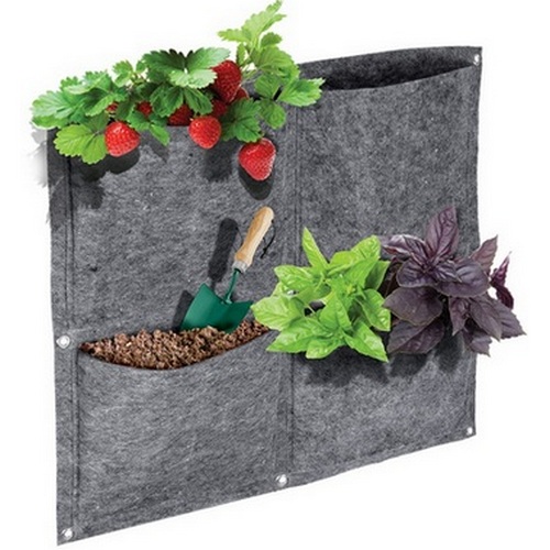 Подвесьте плантер за специальные отверстия ( люверсы) на вертикальную поверхность (ограждение террасы, садового участка, декоративные колонны), в карманы насыпьте грунт, посадите рассаду согласно инструкции, поливайте по мере необходимости.
