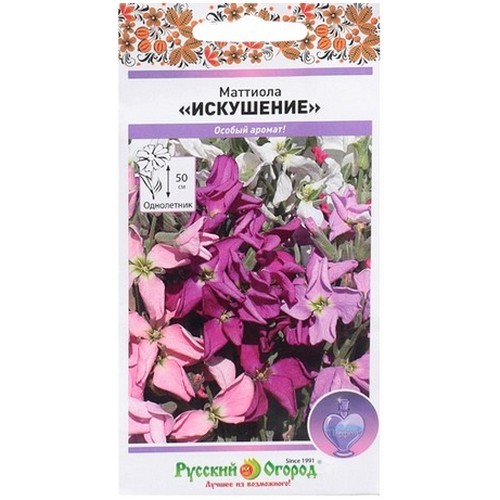 Маттиола Искушение прекрасная смесь фиолетовых, розовых, пурпурных и белых окрасок с ярким сказочным ароматом! В этом вся магическая сила маттиолы как роковой красавицы: очаровать гостей, не давая забыть о себе. Маттиолу зачастую ставят в вазы, чтобы насыщенный аромат распространился по всей квартире. Высота данной смеси около 50 см, поэтому она прекрасно будет смотреться в вазах среднего размера.Маттиола Искушение имеет характерные чуть загнутые края лепестков. Обычно её любят выращивать либо в отдельных вазонах или контейнерах, где садоводам хочется подчеркнуть романтическую атмосферу посадки, либо, наоборот, в крупных миксбордерах. При этом средняя часть клумб отведена именно смеси Искушение. Основная цветовая гамма клумбы может быть фиолетовая, белая, лиловая и даже красная! Игра контрастов сейчас очень часто используется, и при этом действительно вносит много необычных и красивых ландшафтных дизайнерских решений.