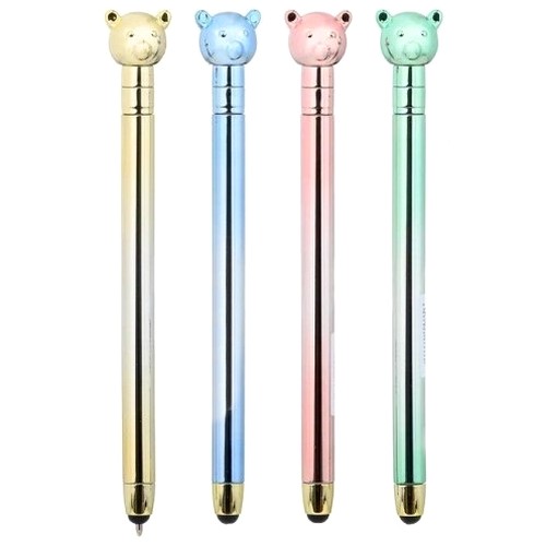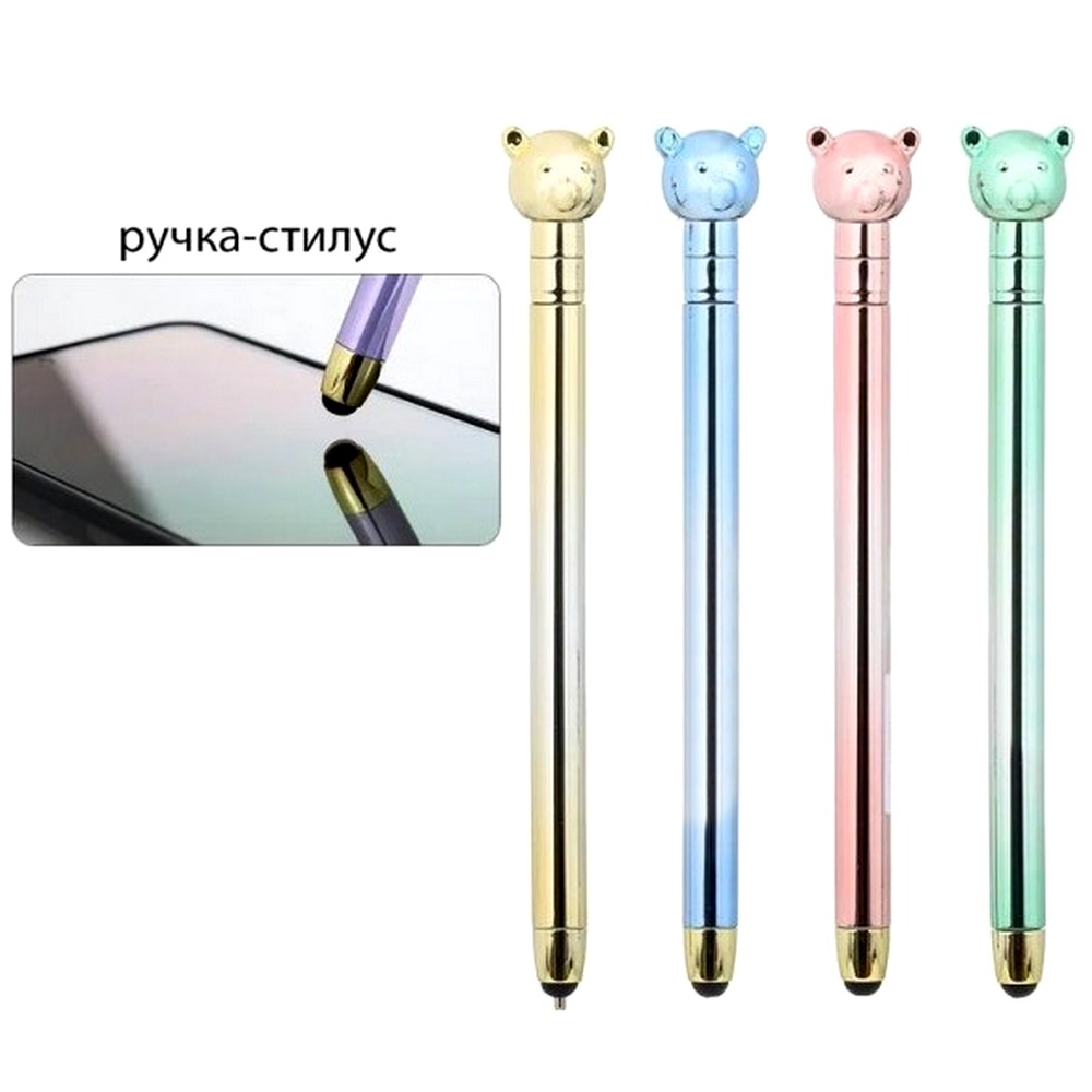 Шариковая ручка с поворотным механизмом+стилус: цветной-металлик корпус, наконечник-мишка.Цвет чернил синий.