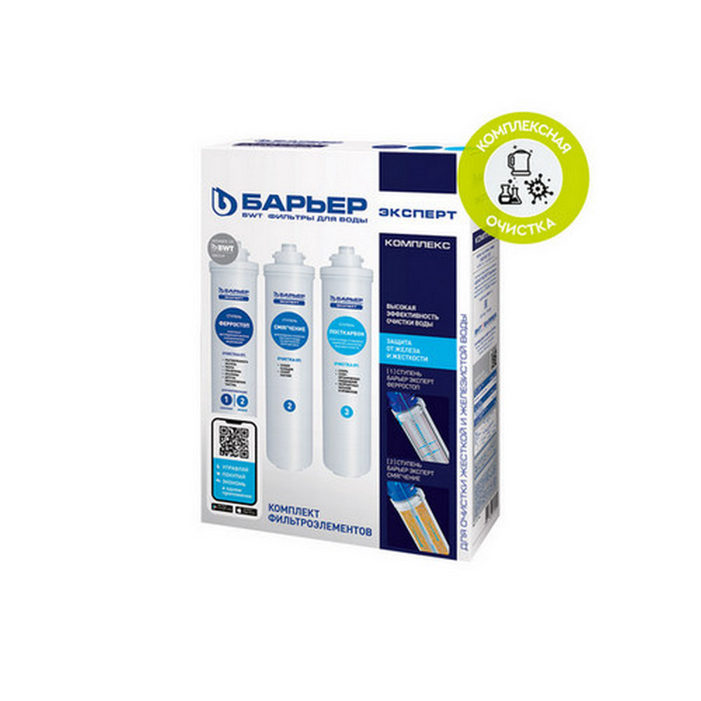 Комплект сменных фильтроэлементов для комплексной очистки железистой и жесткой воды от всех основных содержащихся в ней вредных примесей. Такие картриджи для фильтров используются в трехступенчатых системах очистки Эксперт Комплекс.Купить комплект фильтроэлементов ''Барьер EXPERT Комплекс''