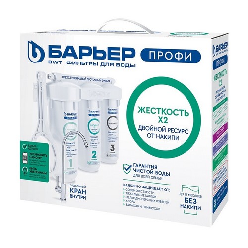 Вкусная чистая вода без накипи! Классический 3-х ступенчатый фильтр с картриджами стандарта SlimLine 10 для доочистки очень жёсткой городской воды. Благодаря увеличенному количеству умягчающей смолы в составе, БАРЬЕР ПРОФИ Жесткость х2 удаляет накипь значительно дольше, чем аналоги.Тип очистки: умягчение воды.