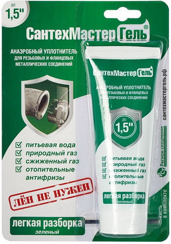Гель Сантехмастер 15 г зеленый РегионСпецТехно (04013) - это анаэробный герметик для металлических резьбовых и фланцевых соединений. Образует высокопрочное уплотнение, устойчивое к различным средам: вода, природный и сжиженный газ, бензин, отопительные антифризы и др. Подойдет для труб диаметром до 1,5 дюймов.Купить гель зеленый Сантехмастер 61033 15г