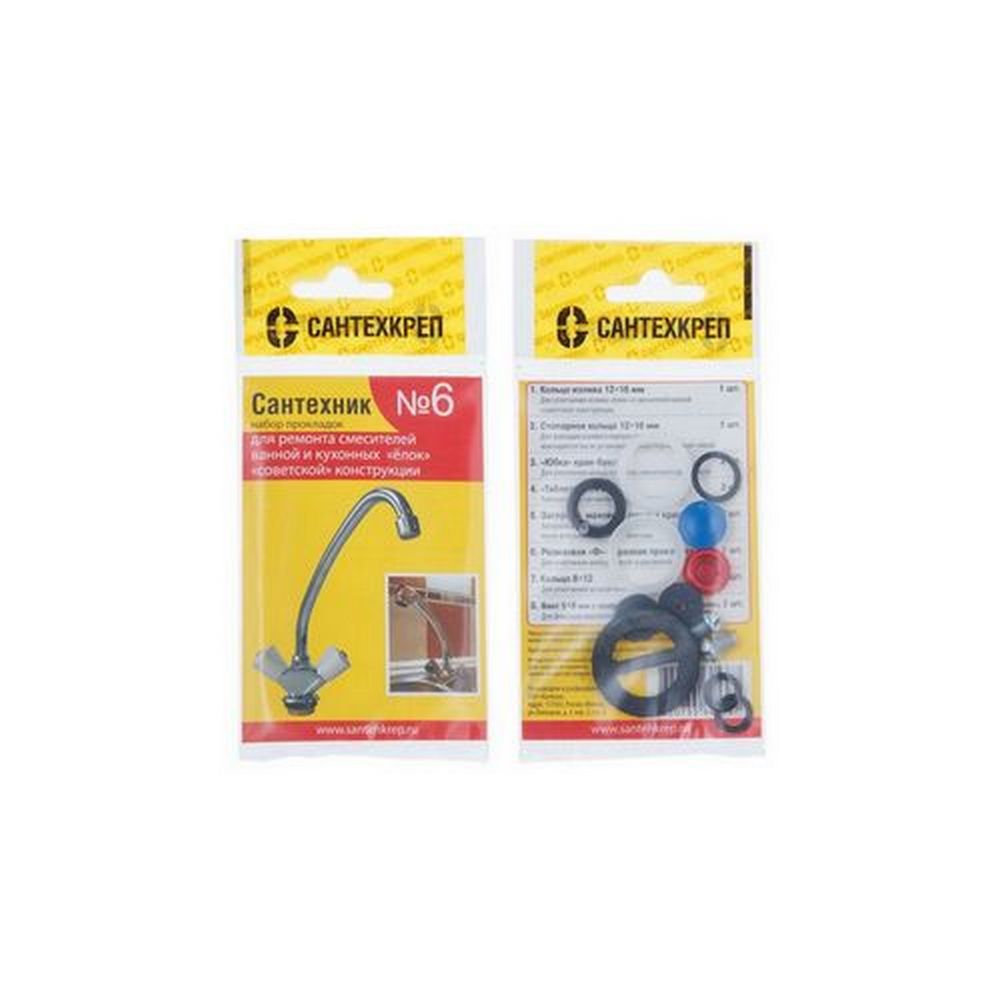 Набор прокладок Сантехник 6 САНТЕХКРЕП используется для ремонта смесителя. Набор состоит из 7 типов прокладок: 1. Кольцо излива 12х16 мм - 1 шт. 2. Стопорное кольцо 12х16 мм - 1 шт.3. ''Юбка'' кран-буксы - 2 шт.