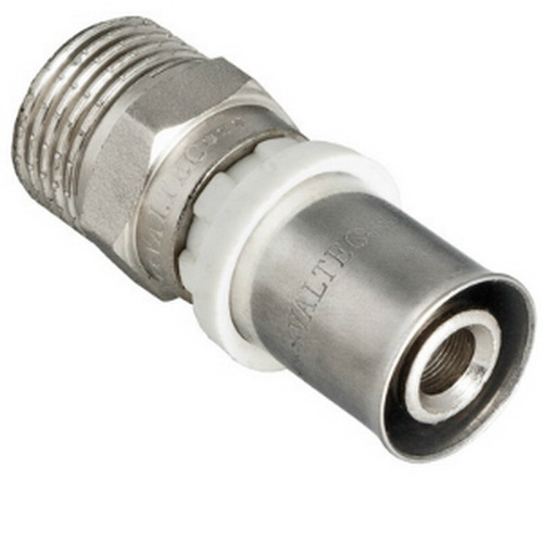 Двухсторонний прямой пресс-фитинг для соединения металлополимерной трубы и компонента системы с резьбовым подключением предназначен для создания соединений металлополимерных труб на основе обычного, сшитого или термоустойчивого полиэтилена. Монтаж соединений производится пресс-инструментом.Купить Соединитель пресс с переходом на наружную резьбу 26 x 1'' Valtec
