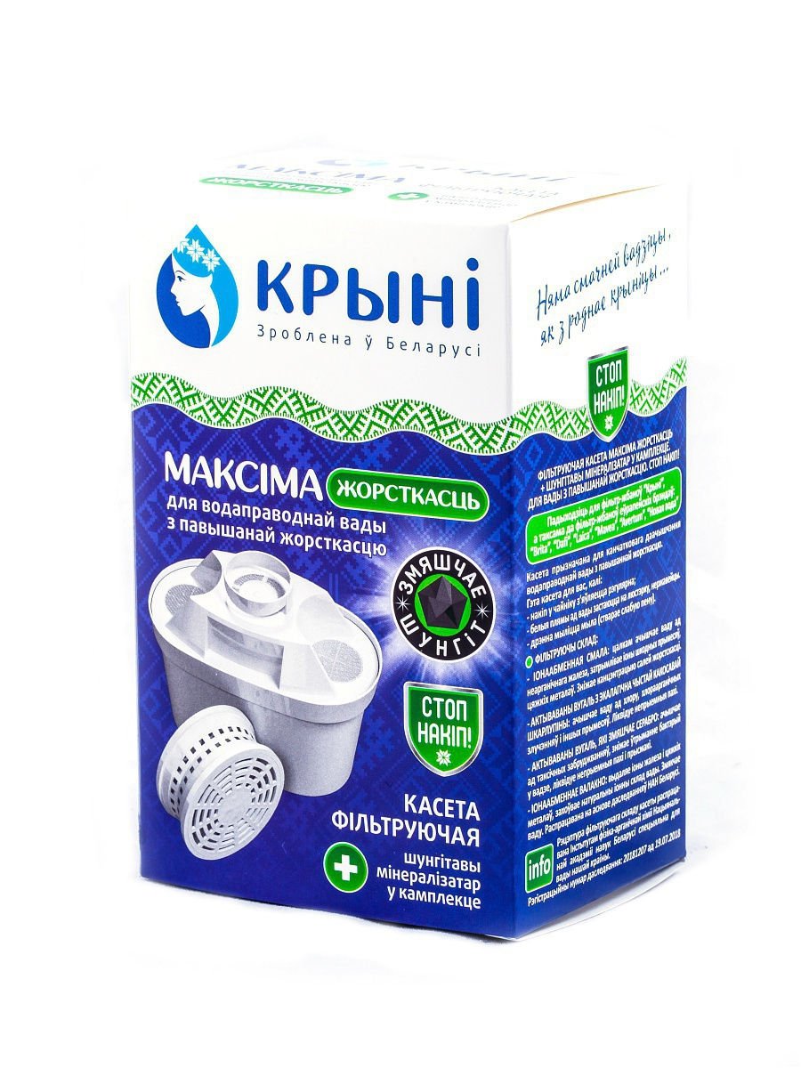 Рецептура фильтра разработана Институтом физико- органической химии Национальной Академии наук Беларуси. Фильтр предназначен для водопроводной воды с повышенной жесткостью (накипь). Эффективно очищает воду от неорганического железа, задерживает ионы вредных примесей, тяжелых металлов. Снижает концентрацию солей жесткости, удаляет хлор и хлорорганические соединения. Удаляет из воды ионы тяжелых металлов и растворенное железо, сохраняя природный ионный состав воды. Шунгитовый минерализатор очищает воду от посторонних привкусов и запахов, обеспечивает сбалансированный вкус и минеральный состав воды. Ресурс фильтрующей кассеты и шунгитового минерализатора 350 л, но не более 3 месяцев с момента начала использования (зависит от качества водопроводной воды). Подходит для кувшина КРЫНI ''Вадавiта'', а также для кувшинов Brita.Купить Сменный фильтр КРЫНI Максiма жорсткасць