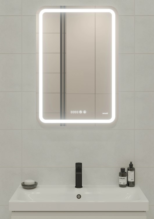 Зеркало Led 050 Design Pro это гармоничное сочетание красоты, функциональности и качества, которое сделает вашу ванную комнату еще более комфортной и стильной. Форма зеркала, вдохновленная дизайном айфон, станет настоящим украшением вашего интерьера.Модель Led 050 Design Pro оснащена встроенной светодиодной лентой с регулировкой яркости. Подсветка лентой смонтирована по краю и наполняет ванную комнату деликатным светом, а также делает ежедневные процедуры ещё комфортнее. Она удобно включается с помощью сенсорной кнопки, а уровень яркости света можно менять в зависимости от задач. В зеркале также установлены часы, чтобы увлекательный процесс ухода за собой не смог отвлечь от важных дел.